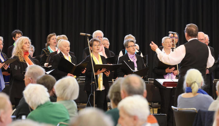 Gut besucht war das Konzert in der Stadthalle Zeilsheim. Der Volkschor Thalia brachte einen bunten Strauß an Melodien zu Gehör. FOTO: Maik ReussHeinz Marosch, der Leiter des Volkschores Thalia 1903, beschreibt das Lied „Von fern klingt leise eine Melodie“ von Manfred Bühler als ein „Tongemälde von besonderer Schönheit“, als er es dem Publikum in der Stadthalle Zeilsheim als erstes Stück des diesjährigen „Thalia-Cafehaus-Konzertes“ ankündigt. Statt Stuhlreihen sind dort zu diesem Anlass lange Tafeln eingedeckt mit Porzellan, an denen die Zuschauer Platz genommen haben und kurz zuvor noch selbst gebackenen Kuchen, frischen Kaffee und gemeinsame Gespräche genießen konnten. Das Format ist seit Jahren beim Publikum beliebt, wie sich auch bei der diesjährigen Auflage wieder einmal zeigt, zu der alle Plätze besetzt sind und das Konzert schon mit Spannung erwartet wird.